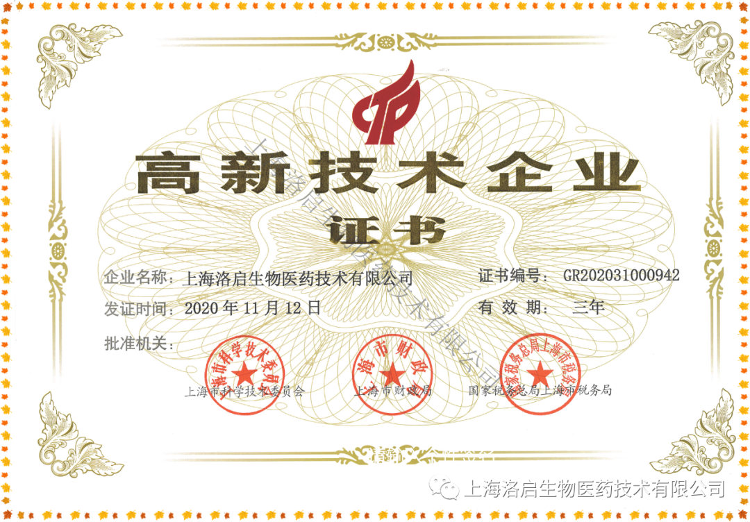 近期,上海evo视讯官网生物医药技术有限公司取得了由上海市科学技术委员会、上海市财政局、国家税务总局上海市税务局联合颁发的“高新技术企业证书”。