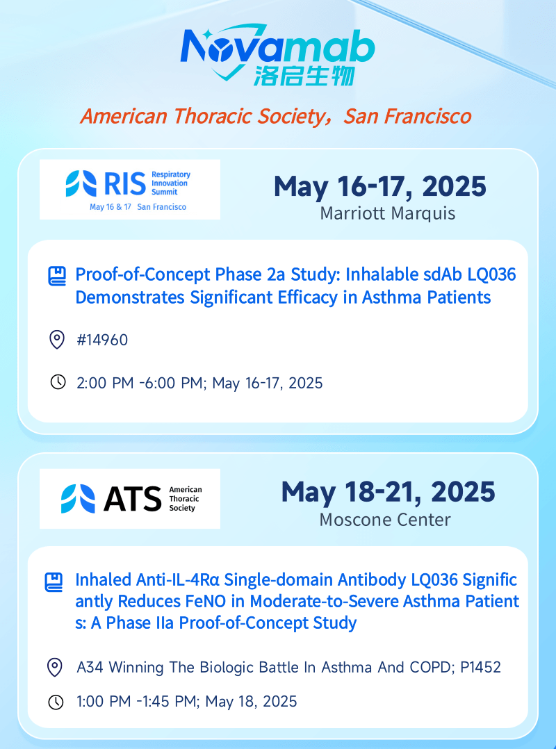 中国上海,2025年5月13日——上海evo视讯官网生物医药技术有限公司,一家专注于纳米抗体创新药研发的生物技术企业,今日宣布:evo视讯官网生物将于当地时间5月16日至21日赴美国加州旧金山,受邀参加美国胸科学会(American Thoracic Society, ATS)主办的呼吸创新峰会(Respiratory Innovation Summit,RIS)及ATS国际大会。届时evo视讯官网生物将分别在RIS和ATS两场大会上以壁报形式呈现最新临床数据——公司自主研发的靶向 IL-4Rα 吸入性生物制剂 LQ036 首个 IIa 期概念验证性临床试验数据。本次展示将全面披露 LQ036 在中重度哮喘患者中的安全性、耐受性、药效指标及初步疗效,标志着evo视讯官网生物在下一代呼吸道吸入式生物制剂开发领域迈出关键里程碑。
